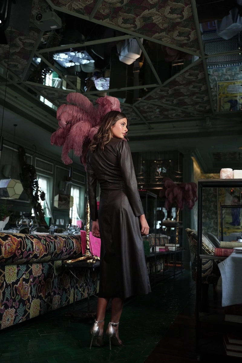 Confeccionado em tecido efeito couro de cor castanha. Centro do corpo franzido. Manga comprida. Abertura central. Comprimento midi. Fecho invisível.