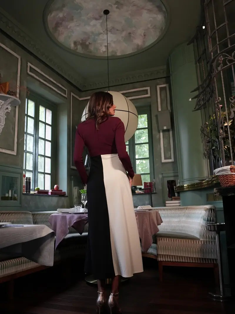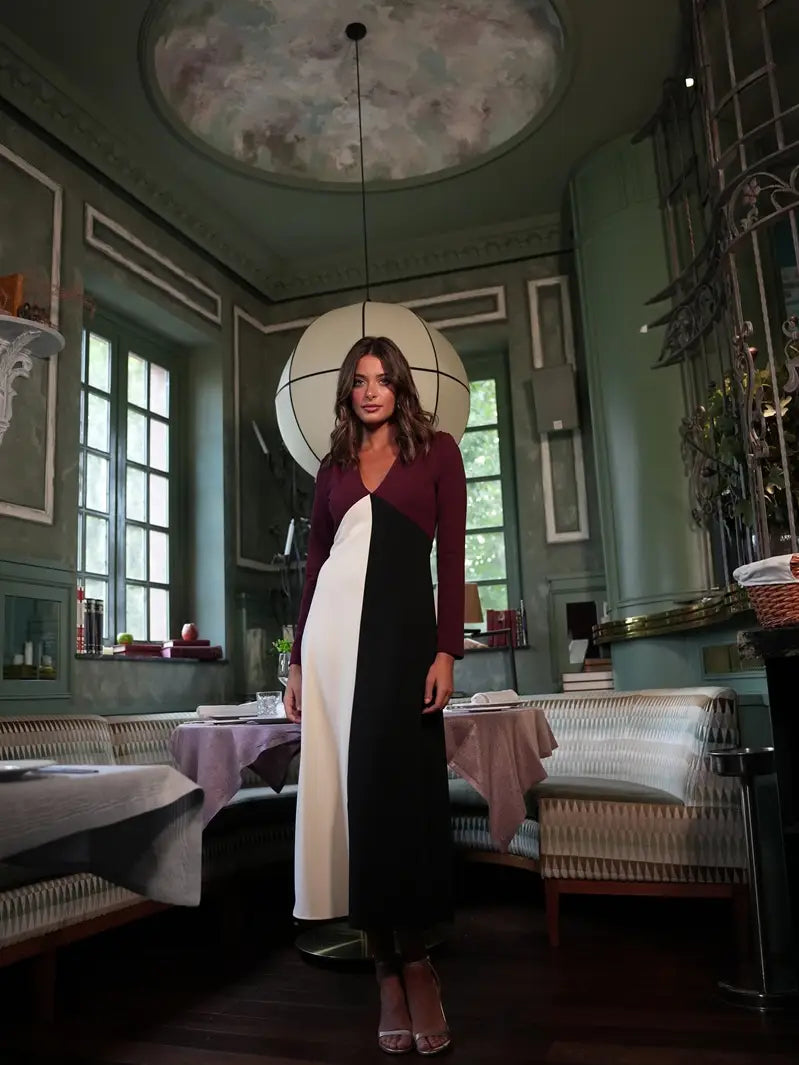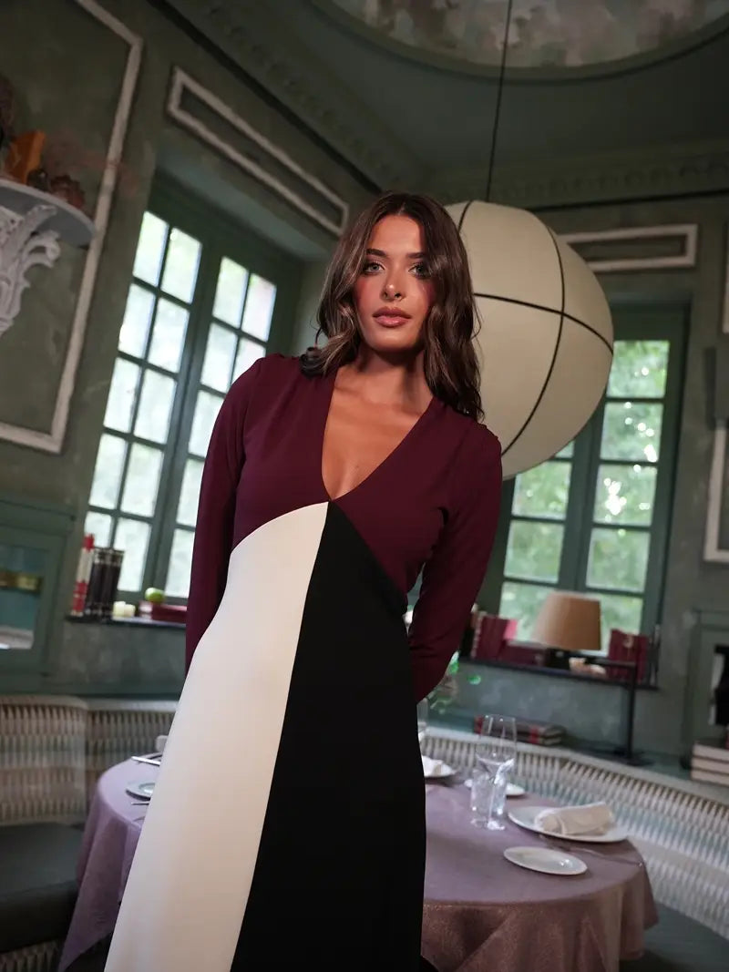 Malha tricolor. Decote em bico. Comprimento midi. Fecho invisível.